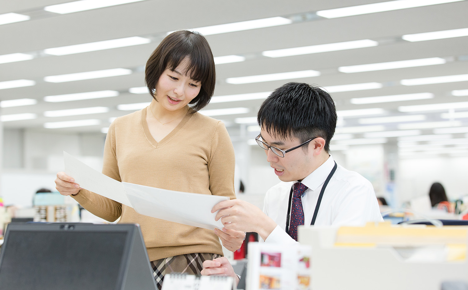入庫後は、基礎研修等で知識を習得した後、配属先において先輩社員とペアとなり、